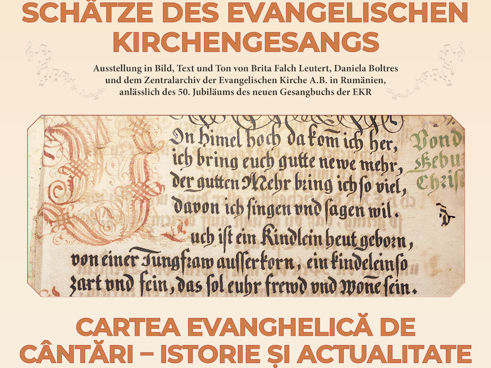 Die Ausstellung in Bild, Text und Ton, "Schätze des evangelischen Kirchengesangs", wird am Dienstag, dem 2. Dezember 2025, um 17 Uhr im Terrassensaal des Teutsch-Hauses in Hermannstadt eröffnet. Die Ausstellung wurde von Brita Falch Leutert und Daniela Boltres anlässlich des 50. Jubiläums des neuen Gesangbuchs der Evangelischen Kirche A.B. in Rumänien (EKR) erarbeitet und mit Exponaten aus dem landeskirchlichen Zentralarchiv und der Redaktion der Hermannstädter Zeitung ergänzt.