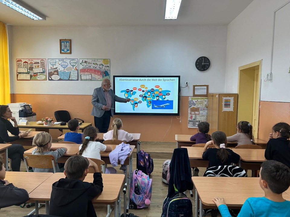 Am 6. Oktober wurde den Schülern des Friedrich Schiller Gymnasiums in Neumarkt/Tg. Mureș eine Sprachreise angeboten. In einem imaginären Flugzeug eingecheckt, haben die Schüler entlang einer Stunde Wörter mehrerer Sprachen kennen gelernt und geübt. Der Reiseleiter war Horst Frank, Linguist und Informatiker. Bevorzugt haben die Schüler die asiatischen Sprachen. Gabi Mezei hat die Sprachstunde besucht.